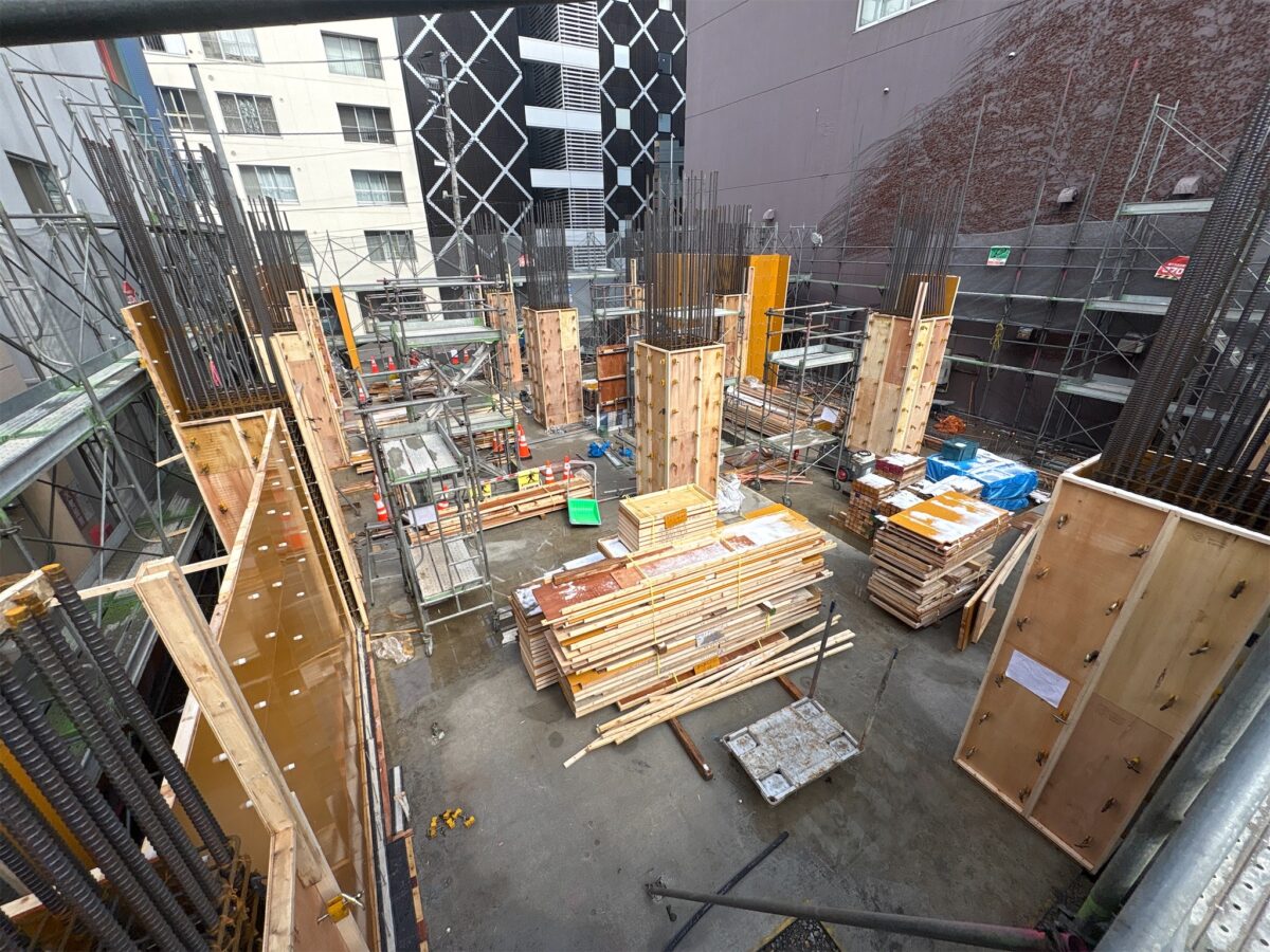 先月2回目の耐圧版コンクリートの打設を行い、現在は1月下旬に予定している3回目の耐圧版コンクリート打設に向けて、鉄筋工事・型枠工事を行っています。