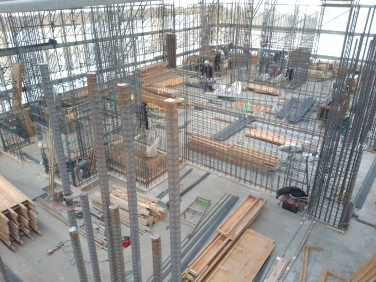 現在は、5階立上り柱・壁の配筋、型枠取付を行っています。