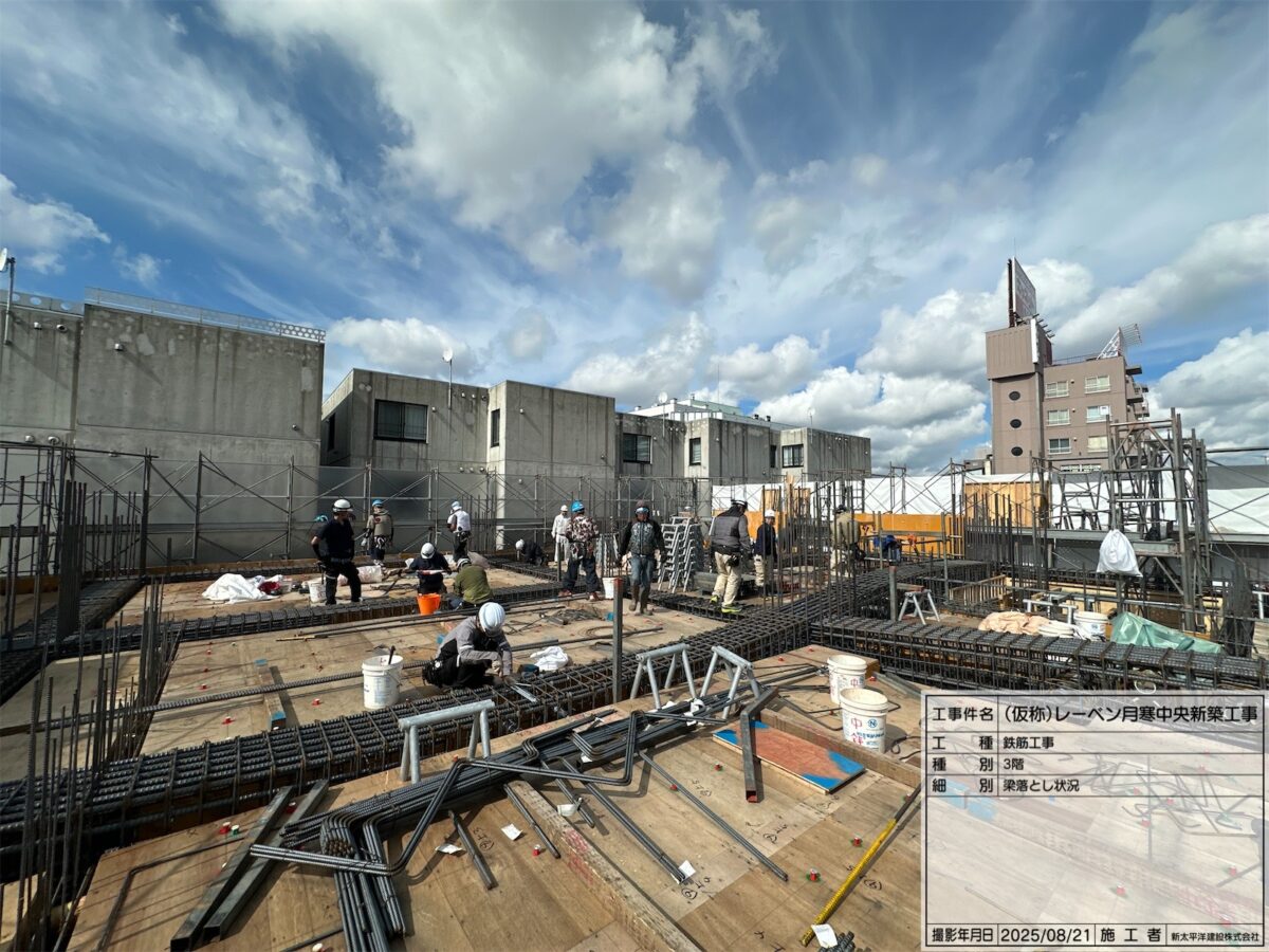 現在は3階立上りに向けて、鉄筋配筋、型枠取付作業中です。