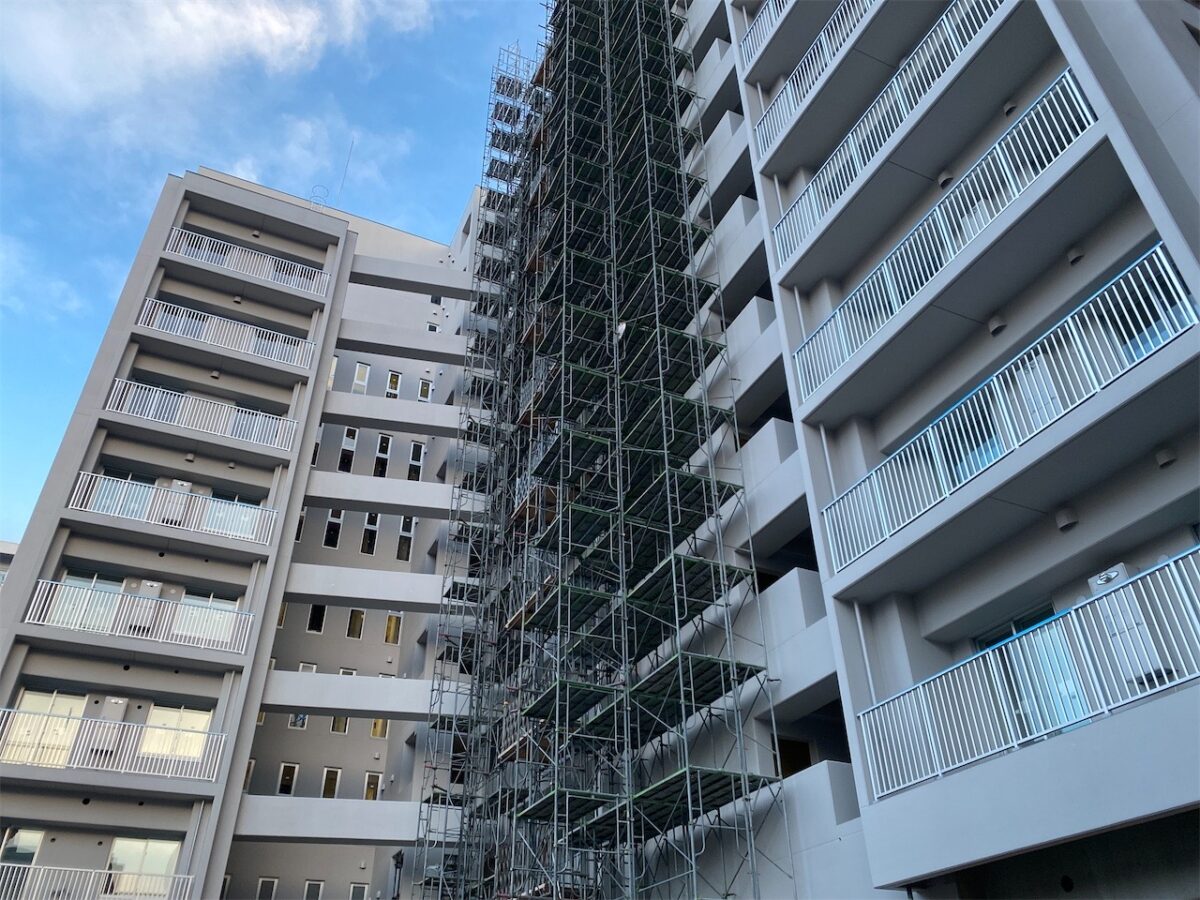 7月下旬には8階立上りのコンクリート打設を控えているので、打設に向けて足場の組立、配筋、型枠建込み等屋外での作業を行っております。