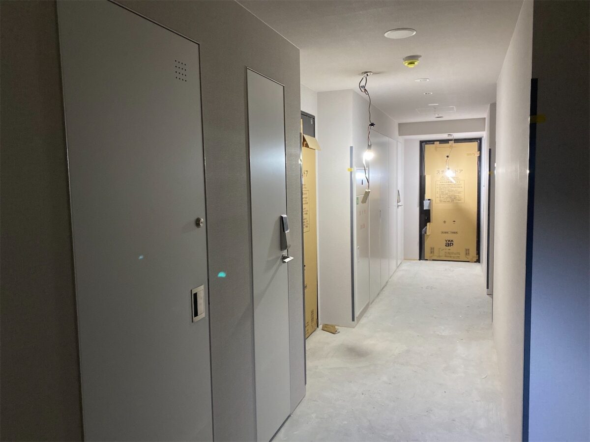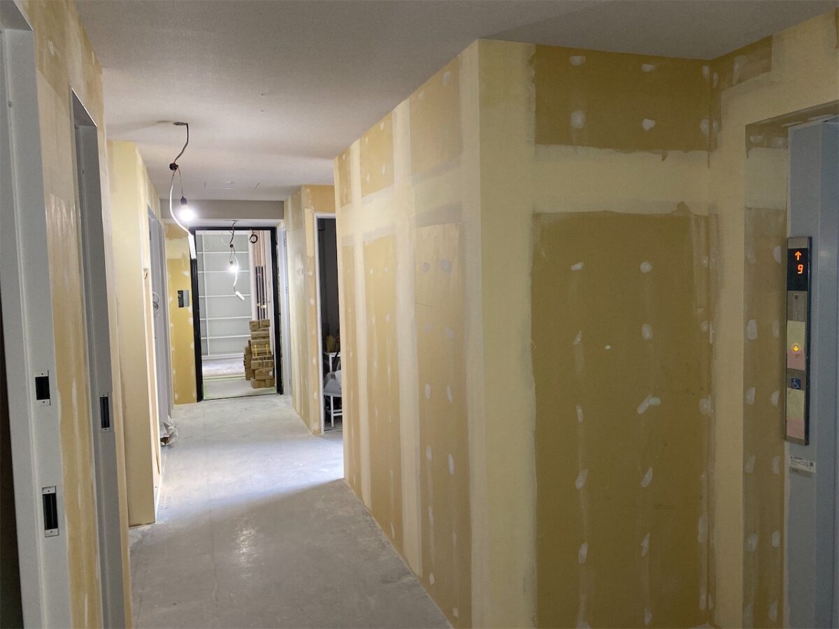 内部では引き続き鋼製建具、LGS、ボード、クロス施工作業が行われています。