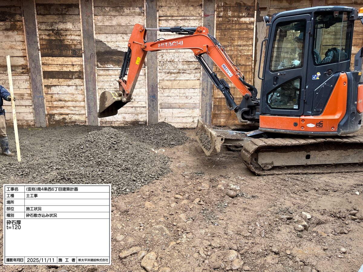 最高掘削深さは5.98mとかなり深くまで掘削予定だったため、一次掘削・二次掘削・最終掘削と3段階で行いました。本日、掘削・矢板入れが完了し、砕石敷き込み・捨てコン打設を行いました。明日からは基礎躯体工事を入ります。