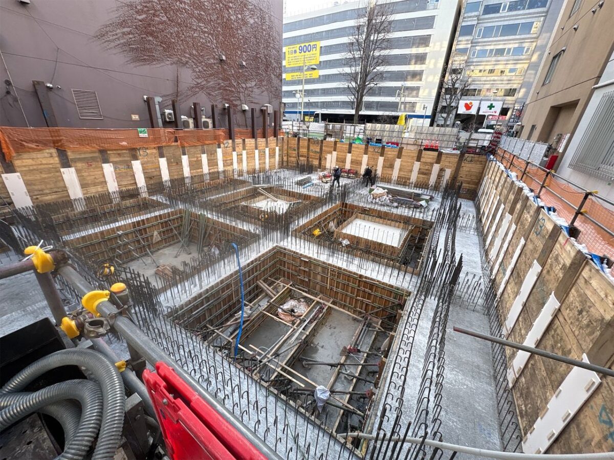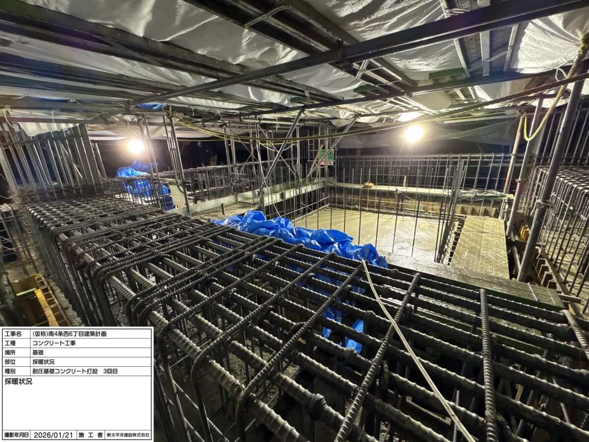 先月2回目の耐圧版コンクリートの打設を行い、現在は1月下旬に予定している3回目の耐圧版コンクリート打設に向けて、鉄筋工事・型枠工事を行っています。
