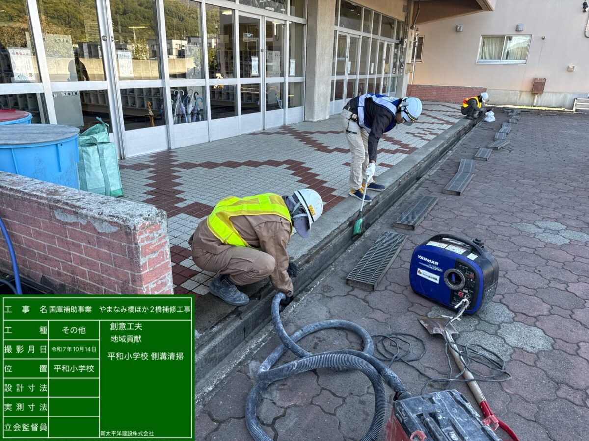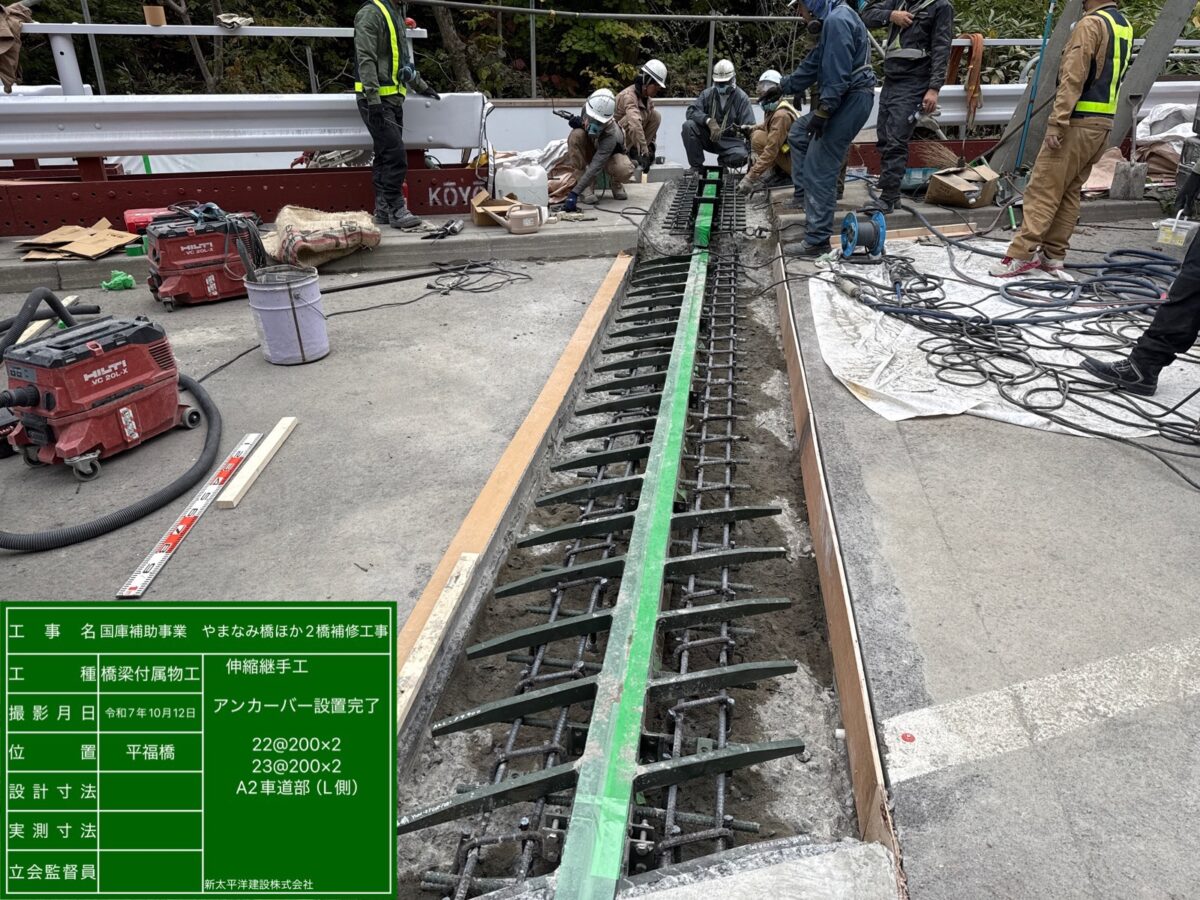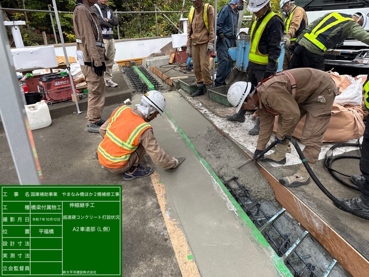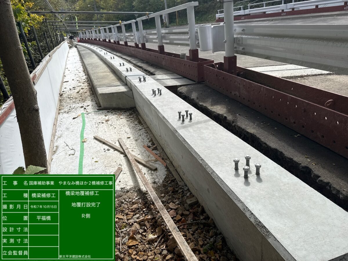 平福橋での地覆打設、伸縮装置撤去・設置作業が10月13日に完了しました。