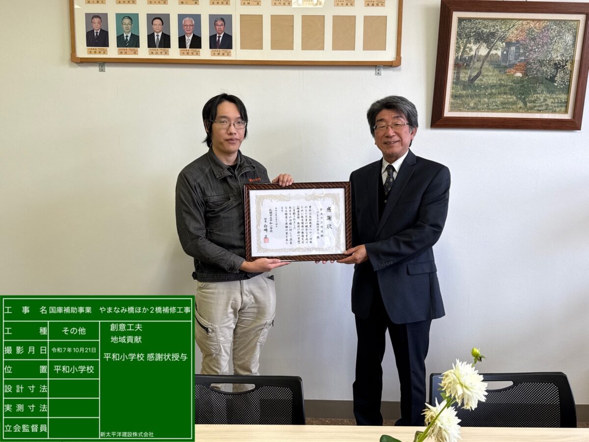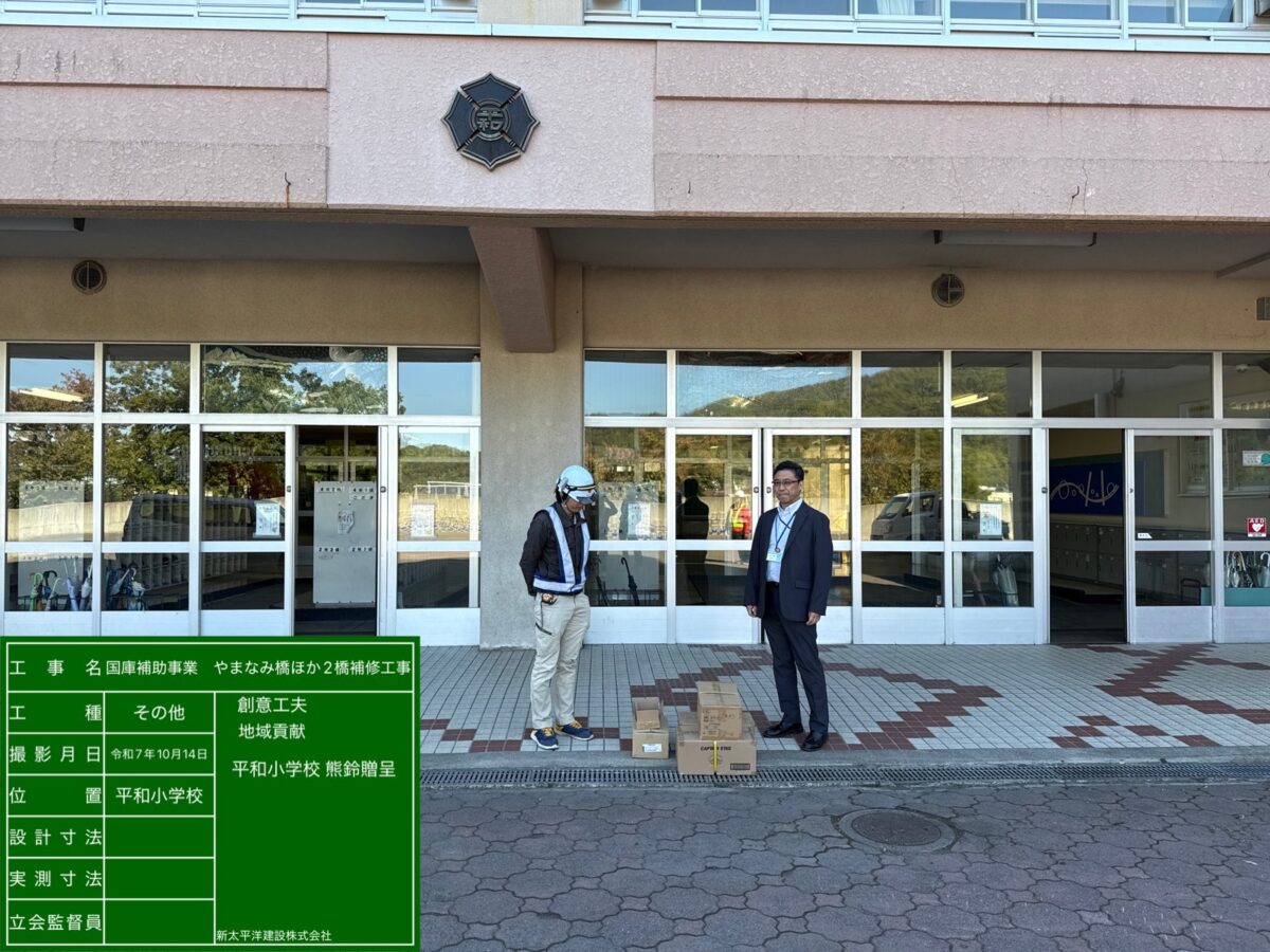 10月14日に地域貢献として、札幌市立平和小学校に全校生徒分の熊鈴の贈呈と校内の側溝清掃を行いました。