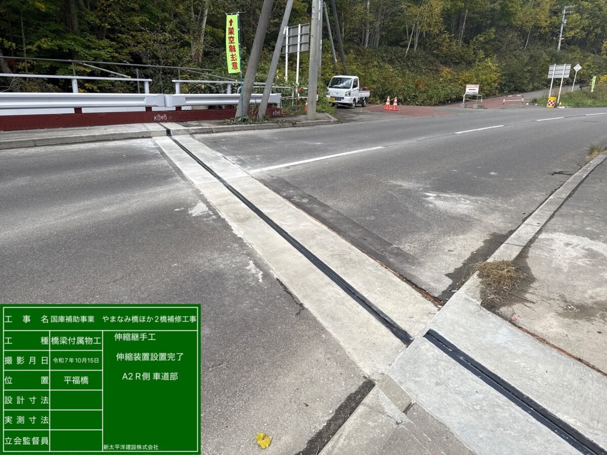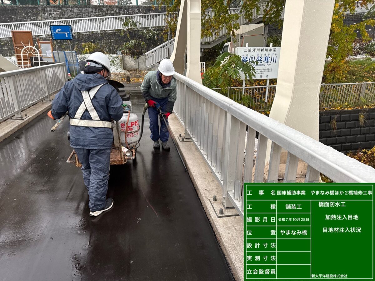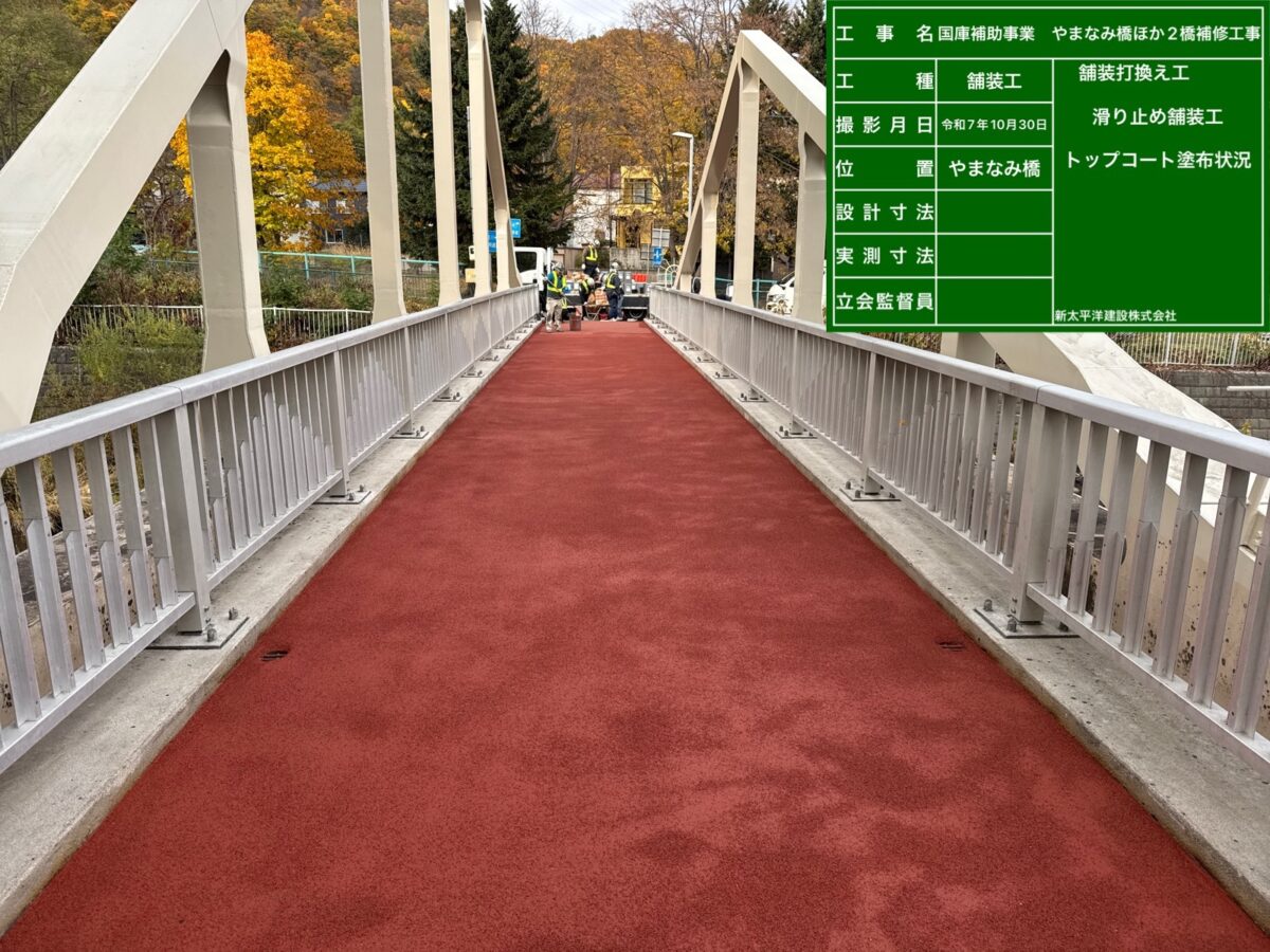 やまなみ橋での加熱注入目地、滑り止め舗装作業が10月30日に完了しました。