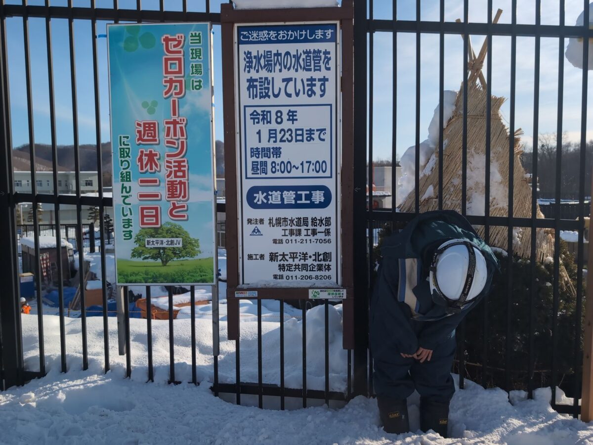 先月は当現場の工事標識を白川浄水場の出入口の柵に設置しました!