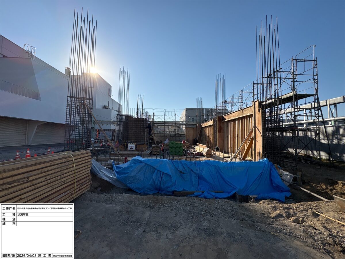 現在、スカム排水管及び置換水管の接続に伴う土工事、躯体工事を行っております。また、12月の中頃には鋼矢板打込工事も予定しております。