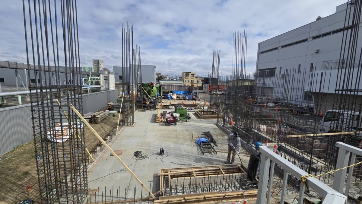 現在は来週の立ち上がり打設に向けて配筋、型枠建て込み作業が行われています。